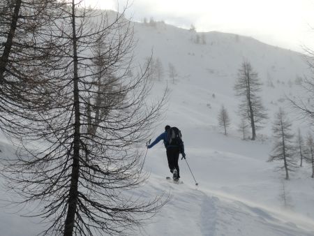 Nach einer unerwartet guten Abfahrt in knietiefem Pulver steigen wir wieder rund 600 HM zu unserem Ausgangspunkt auf. |