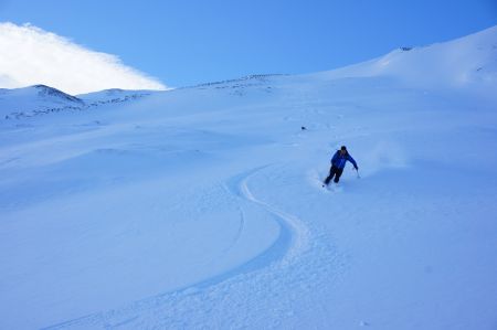 Kurze Pause für Pina vor dem Wiederauffellen für den Aufstieg auf den Hirschkopf. Wir genießen die herrliche Abfahrt im Pulverschnee. |