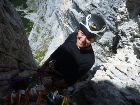 ![]() Schon nach der ersten Seillänge steilt die Tour auf und verfolgt Riss- und Kaminsysteme. |