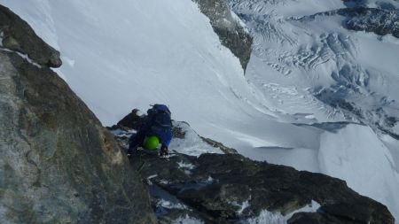 ![]() So steigen wir noch zum Skidepot auf rund 3.700m auf, um die Ski mit den Steigeisen zu tauschen. Im großteils schneefreien Fels und über die steilen Firnflanken geht es weiter auf den italienischen Gipfel. |